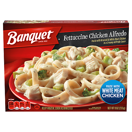 Banquet Fettuccini Chicken Alfredo frozen meal brings the home-cooked flavor to your table in minutes. This frozen dinner features white meat chicken, broccoli and fettuccini noodles with Alfredo sauce for delicious ready made meals. Enjoy Banquet frozen meals as convenient frozen lunches, or quick dinners when you're in the mood for noodles and Alfredo. Preparation of frozen prepared meals is quick and easy. Follow the instructions on the package to prepare frozen dinners in the oven for fresh-baked taste or microwave for a quicker cook time. Store the 9 ounce pasta meal in the freezer until you’re ready to enjoy frozen entrees. in the U.S.A. for over 60 years, Banquet has been making delicious food the whole family loves.