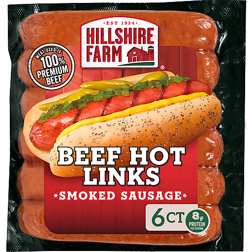 Enjoy flavorful, quality sausage with Hillshire Farm Beef Hot Links Smoked Sausage with Spicy Red Pepper. Fully cooked and ready to heat & eat, our Hillshire Farm Hot Links are made with 100% premium beef. Seasoned and smoked to perfection, our beef hot sausage links with spicy pepper come in 12-ounce packs with 6 servings each. Made with spicy red pepper to bring on the heat, our Hillshire Farm hot beef links are easy to make on a grill, stove top, or microwave for a weeknight dish everyone can enjoy at family dinner. With 8g of protein per serving, our hot smoked beef sausage links are perfect for your next backyard barbecue. Serve with hot peppers and melted provolone cheese on a toasted bun for a hot bite. Keep refrigerated until ready to prepare and cook thoroughly. For easy-to-make smoked sausage links, enjoy Hillshire Farm Beef Hot Links.