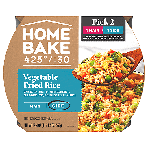 Dinnertime made simple. Just pick 2. Spend more time with the ones you love and less time cooking with HomeBake 425°/:30. We’ve got you covered with frozen mains and sides you can mix and match to create a dinnertime solution everyone will love. Our HomeBake 425°/:30 Vegetable Fried Rice features seasoned long grain rice with egg, broccoli, green onions, peas, water chestnuts and carrots. Add a main, like our Honey Sesame Ginger Chicken, and enjoy a family dinnertime solution that looks and tastes homemade any night of the week. With HomeBake 425°/:30, one main and one side bake together at 425 degrees Fahrenheit for 30 minutes. Using the same oven, same temperature and same cook time means less prep and cleanup, and more time spent with friends and family. HomeBake 425°/:30 is food that makes family happen.