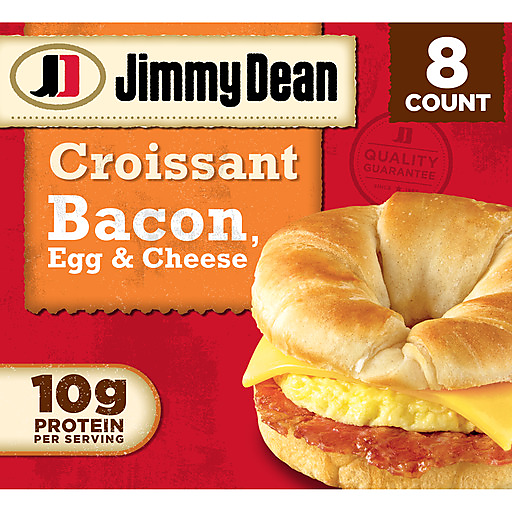 Rise and shine for a warm croissant sandwich with Jimmy Dean Bacon, Egg and Cheese Croissant Sandwiches. Tasty bacon, fluffy eggs and melty cheese all come together on a buttery croissant for a frozen breakfast sandwich that gives you a delicious start to your day. Packed with 10 grams of protein per serving, Jimmy Dean breakfast sandwiches help give you more fuel for your morning.