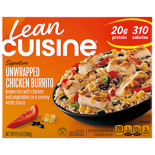 Add a kick of protein to your day with a Lean Cuisine Protein Kick Unwrapped Chicken Burrito Frozen Meal. With 310 calories and 20 grams of protein per package, this easy-to-make Lean Cuisine unwrapped chicken burrito entree features brown rice with white meat chicken and vegetables in a creamy verde sauce. Enjoy this 9.5-ounce frozen chicken meal on its own or with a side salad as part of an easy comfort food meal. Pair your Lean Cuisine frozen unwrapped burrito entree with soup, or customize it with your favorite add-ons. Quick and easy to prepare, this microwave meal is ready in less than six minutes, making it a convenient lunch, dinner or snack at home or in the office. Lean Cuisine TV dinners are made with premium ingredients for a tasty frozen dinner that rivals take-out. This delicious Lean Cuisine gluten free frozen burrito meal is made with no artificial flavors or colors* and offer 1/2 cup of vegetables per serving for a satisfying frozen meal you can feel good about. Lean Cuisine frozen meals are not your mother’s diet food. Lean Cuisine helps you take control of your wellness goals with a variety of delicious frozen dinners and snacks, all 400 calories or less. For more frozen meals from Lean Cuisine, try Sweet and Sour Chicken or Shrimp Alfredo.