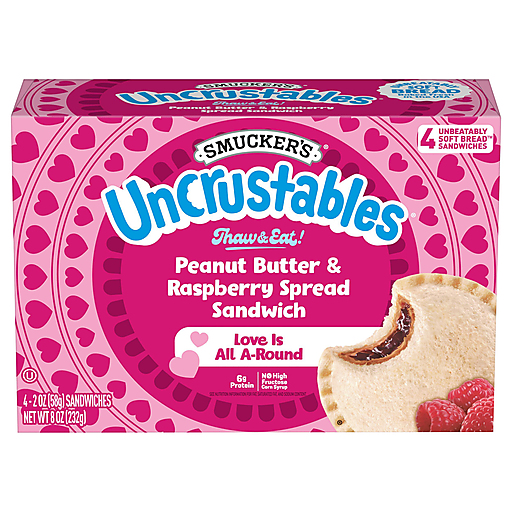 Make busy days more doable with Smucker’s Uncrustables frozen sandwiches — the easiest kid-approved snack and lunch food ever. This box contains four (4) individually wrapped sandwiches. Just grab one from the freezer in the morning, and it's thawed and ready to make your kid's day by lunchtime. No fuss. No crust. It’s just The Best Part of the Sandwich, with the yummiest tastes and textures. The outside of an Uncrustables Peanut Butter & Raspberry Spread Sandwich is Unbeatably Soft Bread Baked Fresh in the USA, and the inside is packed with creamy peanut butter and smooth, sweet raspberry spread. An unbeatable combo, with no high-fructose corn syrup, and no artificial sweeteners or colors. Basically, these super-convenient snacks and lunch foods provide the ultimate PB&J experience. Try ’em all! There’s a kid-friendly flavor for every day of the school week.